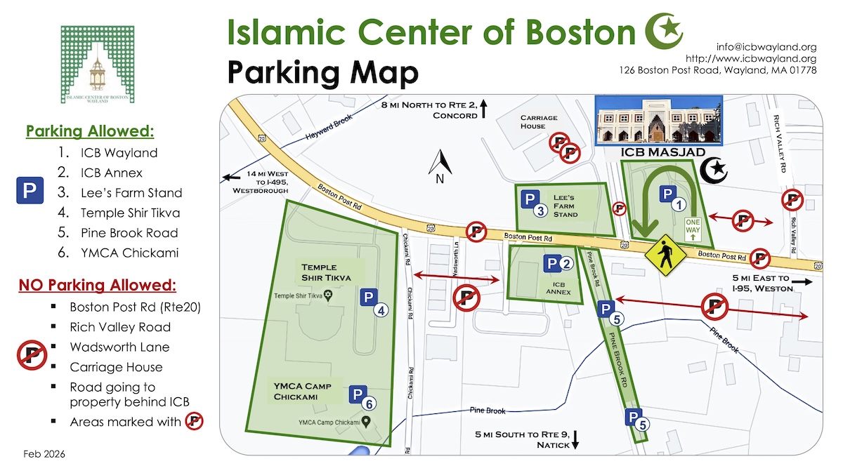 Take Rte: 20 west. Drive for about five miles till you see Mahoney's nursery on the left hand side. Islamic Center of Boston is across from it on the right hand side.
